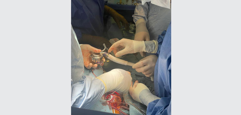 The device is implanted through open-heart surgery and connected to an external controller and power source, which the patient wears for convenient management.